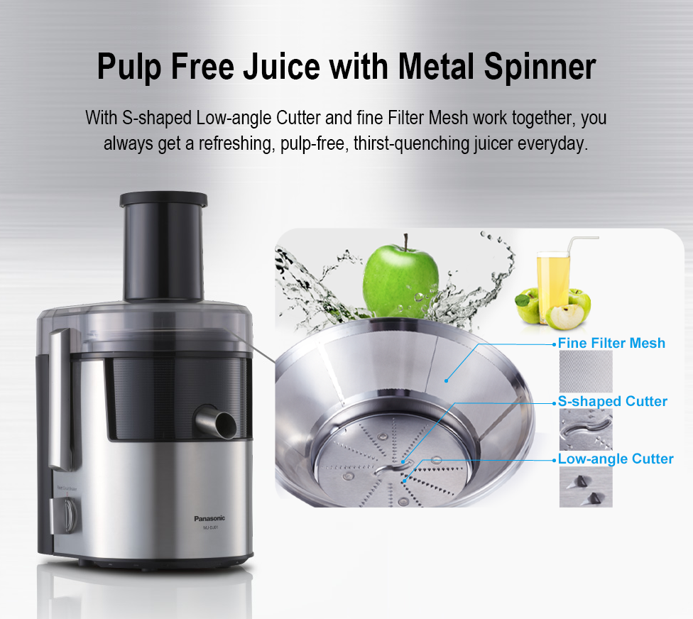 دستگاه MJ-DJ01 یکی از آبمیوهگیریهای پاناسونیک است. این دستگاه از بدنهای از جنس استیل ضد زنگ ساخته شده و استحکام زیادی دربرابر ضربه دارد. قسمت ورودی میوهها در بخش بالایی دستگاه واقع شده است که با قطر زیادی که دارد، میتواند بهآسانی قطعات بزرگ میوه را از خود عبور دهد. این ویژگی کار با دستگاه را آسانتر کرده و به آن سرعت بخشیده است. لیوان مخصوصی نیز به همراه این مدل به کاربر ارائه میشود که ابعاد و طراحی آن مخصوص همین دستگاه طراحی شده است و میتوانید برای جمعآوری آبمیوهی تهیهشده، آن را زیر دستگاه قرار دهید.