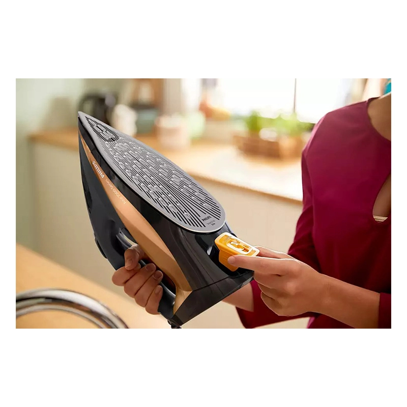 کفی به کار رفته در این محصول از جنس استیم گلاید پیشرفته بوده که به راحتی شکسته نمی شود و رد برق را بر روی لباس هایتان بر جا نمی گذارد. طبق ادعای کمپانی فیلیپس کفی این محصول به قدری با کیفیت بوده که با برخورد با دکمه های جین نیز خط و خش نمی بیند. نوک کفی این اتو نیز به گونه ای بوده که به راحتی یقه و یا فاصله ی بین دکمه ها را نیز اتو کشی می کند. توان و قدرت در اتو بسیار حائز اهمیت است. توان و قدرت این محصول 2800 وات بوده که از پس سخت ترین چروک ها نیز بر می آید. مخزن آب این محصول 300 میلی لیتر گنجایش و در کمتر از 30 ثانیه قادر به تولید بخار است.