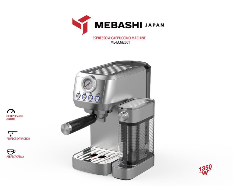 اسپرسو ساز مباشی مدل ME-ECM 2501 جدیدترین شاهکار کمپانی مباشی در بین دستگاههای اسپرسوساز خانگی که با قابلیت ساخت کاپوچینو به صورت اتوماتیک به تازگی به بازار عرضه شده است. بدنه تمام استیل این دستگاه در کنار قدرت فشار بخار 20 بار و توان مصرفی 1350 وات یک شاهکار بی نظیر را از یک اسپرسوساز و کاپوچینو ساز اتوماتیک به ظهور رسانده است.