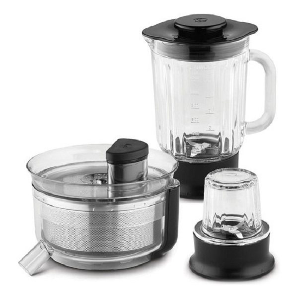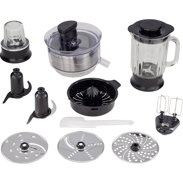 ظروف مخلوطکن، خردکن و آبمیوهگیری پلاستیکی، شفاف و باکیفیت هستند. دیسکهای رنده و برشزن متنوع در این مدل به تهیهی مواد اولیه و آماده کردن آنها برای طبخ انواع غذا کمک میکنند. تیغهی خردکن از جنس استیل ضدزنگ است و هرچیزی را خرد و ریز میکند. پرهی همزن دوگانه برای همزدن سسها و خمیرهای سبک مناسب است. بهاینترتیب تهیهی شیرینی و سسهای متنوع ممکن میشود. همراه این مدل، متعلقات آبمرکباتگیری هم عرضه میشود. قسمت آبمیوهگیری که شامل تیغه و فیلتر است، همراه این مدل به خریداران عرضه میشود که میتواند میوههای خشکتر مانند سیب یا میوههای مشابه را آبگیری کند؛ مقداری از لرد و پالپ میوه هم وارد آبمیوه میشود تا هم طبیعیبودن آن مشخص و هم طعم آن بهتر شود.