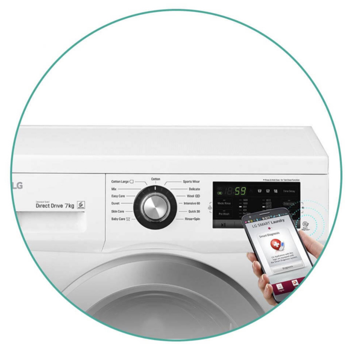 این روش بسیار بروز و پر کاربرد در ماشین لباسشویی ال جی LG FH2J3QDNP0 می باشد که برای جلوگیری از خرج تعمیرکار و حمل و نقل پردرد سر استفاده می گردد کافی است که اپلیکیشن شرکت را بر روی موبایلتان نصب کرده و با هر بار خطا ویا مشکل در سیستم لباسشویی موبایل را به جلو لباسشویی برده و با تولید فرکانس محل مشکل را پیدا نمائید و اقدام به رفع آن کنید و ویژگی مهم دیگری که دارد این است که می توانید دیگر برنامه های شستشو را با این اپلیکیشن دانلود نمائید وبر روی لباسشویی به کار بیندازید.