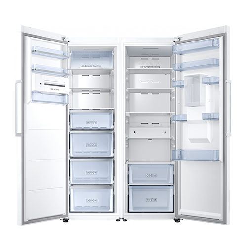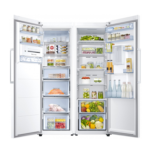 یخچال فریزر دوقلو سامسونگ مدل RR39 و RZ32 در واقع دو یخچال جدا از هم ولی قرینه همدیگرند که هم بصورت مجزا و هم با یکدیگر می توانند در کنار یکدیگر قرار بگیرند. بر روی هر دو درب دستگیره های عمودی تعبیه شده اند که دارای طراحی آرگونومیک است و عملکرد باز و بسته کردن را بسیار راحت می کند.